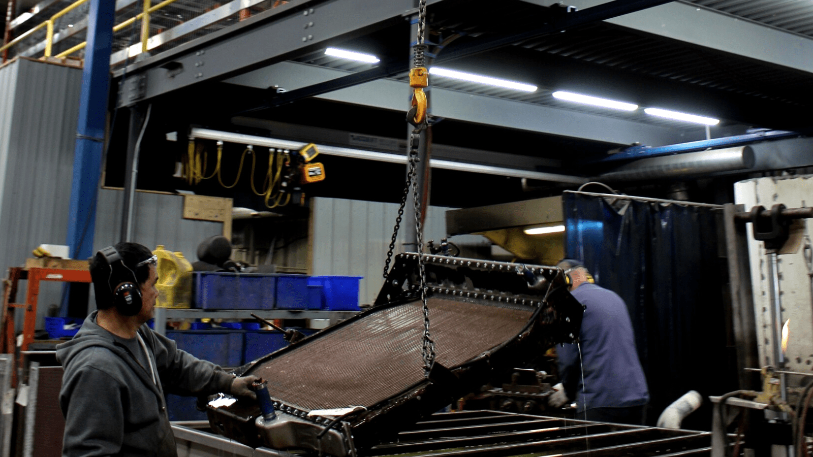 Each crane allows us to lift parts up to 4,000 pounds. This sets our shop apart as it allows us to easily access the rad from all angles, remove each individual section and maneuver them safely through the shop.
